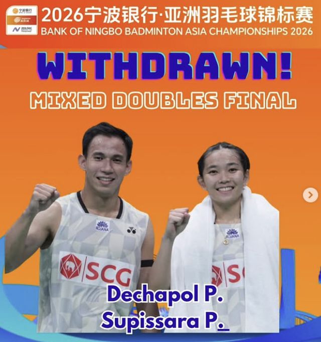 아시아배드민턴연맹(Badminton Asia)은 11일 오후 7시(한국시간) 2026 아시아배드민턴선수권대회 혼합복식 결승에 오른 데차폴 푸아바라누크로-수피사라 파루삼프란(태국·세계 3위) 조가 결승전을 포기했다고 알렸다.