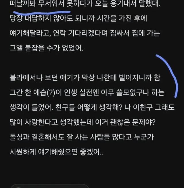 - 감정의 대립: 여전히 여자친구를 많이 사랑하지만, '돌싱'이라는 프레임이 주는 무게감을 감당할 수 있을지 스스로에게 묻고 있는 상황입니다.