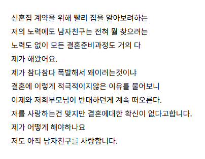 현재 작성자는 여전히 남자친구를 사랑하며 결혼을 진행하고 싶어 하지만, 상대방의 마음은 이미 얼어붙었습니다. 결혼 준비의 모든 짐을 혼자 짊어지며 지쳐버린 작성자와, 과거의 상처에 갇혀 한 발짝도 나가지 못하는 남자친구 사이의 간극은 매우 깊어 보입니다.
