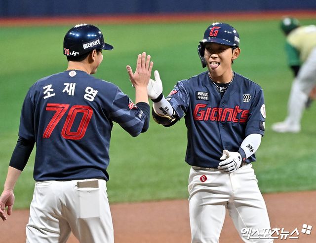 김태형 감독은 "황성빈이 1번타자에서 역할을 해줘야만 팀에 활기가 돈다"면서 리드오프 역할을 착실히 수행 중인 황성빈을 칭찬했다.
