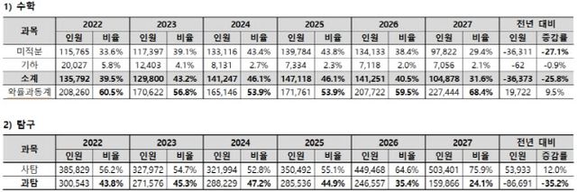 앞서 교육부는 이과생들의 인문계열 지원 러시로 인해 발생한 ‘문과 침공’에 대한 개선책으로 2025학년도 수능부터 사탐 2과목 응시자도 자연계 학과에 지원할 수 있게 했다. 대학 재정 지원사업(고교 교육 기여 대학 사업) 평가지표에 수능 선택과목 제한 폐지를 반영한 것이다. 수학 역시 선택과목 제한이 폐지되며 2027학년도 기준 전국 174개 대학 중 자연계 모집에서 이과 수학을 필수로 반영하는 대학은 서울대가 유일하다.