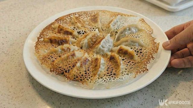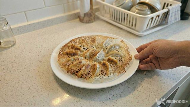 접시에 담을 때도 한 가지 포인트가 있다. 팬보다 큰 접시를 뒤집어 덮은 다음, 팬 손잡이와 접시를 함께 단단히 잡고 한 번에 뒤집어야 한다. 망설이면 날개가 찢어질 수 있다. 이렇게 담아내면 하얗게 퍼진 바닥 날개 위로 만두가 둥글게 올라가 눈꽃처럼 보이는 모양이 완성된다.