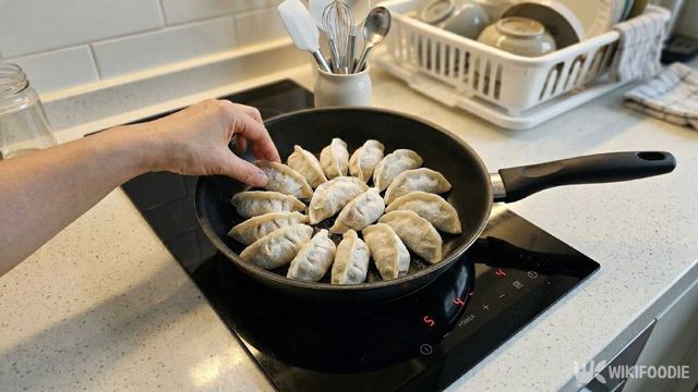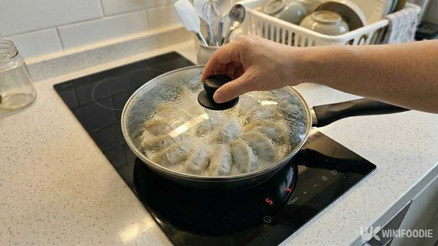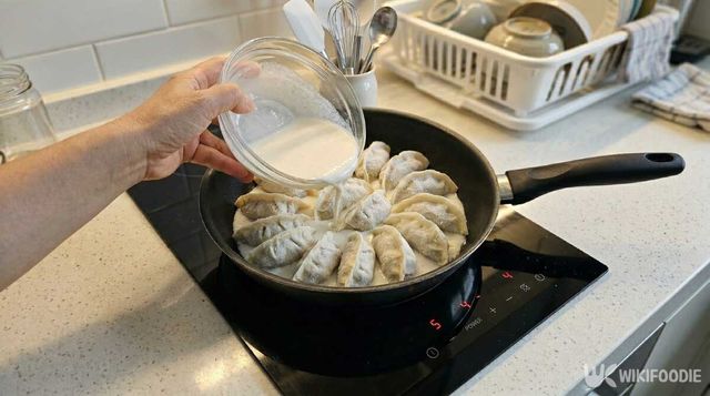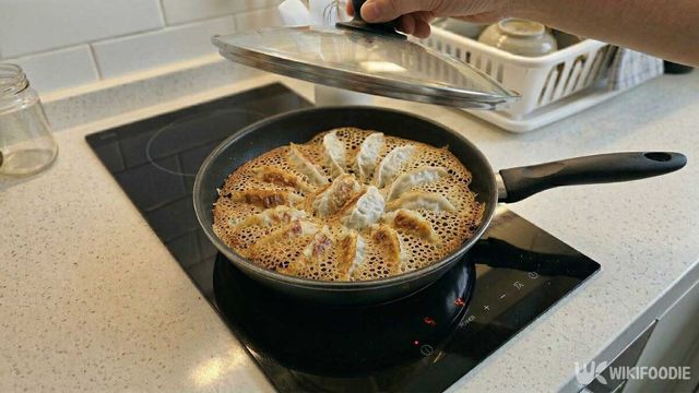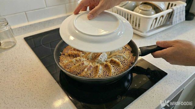 만두를 올린 팬을 중불에 올리고 30초 정도 지나 팬 바닥이 따뜻해지기 시작하면 준비한 반죽물을 만두 둘레와 사이사이에 천천히 붓는다. 한꺼번에 부어 넘치게 하지 말고 팬 바닥을 따라 얇게 돌려 붓는 식으로 채워주면 좋다. 반죽물을 부은 뒤에는 바로 뚜껑을 덮는다. 그리고 중강불에서 3분 30초에서 4분 정도 그대로 익힌다. 이때 중간에 뚜껑을 열지 않아야 만두 속에 열이 고르게 돌고, 바닥도 예쁘게 굳는다.
