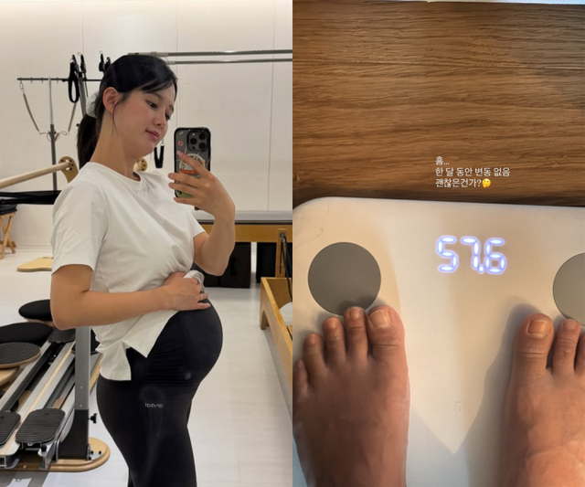 공개된 사진에는 체중계 위에 올라선 모습이 담겼다. 체중계에는 57.6kg이라는 수치가 표시돼 눈길을 끈다. 특히 남보라는 임신 중임에도 한 달간 체중 변화가 없었다고 밝혀 걱정을 드러냈다.