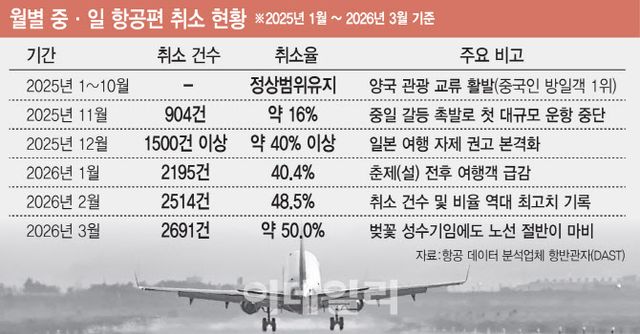 중국 관영 글로벌타임스는 11일 중국 교통 데이터 분석 플랫폼 항방관자(DAST)를 인용해 3월 한 달 동안 중국 본토와 일본을 오가는 항공편 2691편이 취소됐다고 밝혔다. 이는 전체 운항 계획 대비 취소율이 49.6%에 달하는 것으로, 전월(48.5%) 대비 1.1%포인트 상승한 수치다.