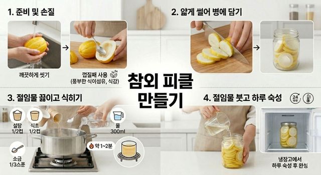 [인포그래픽] 기사를 바탕으로 AI가 생성한 자료사진. 참외는 깨끗하게 씻어 씨를 제거한 뒤 썰어준다. 절임물을 만들고 참외를 병에 담아 절임물과 함께 하루 정도 숙성시키면 참외 피클이 완성된다.