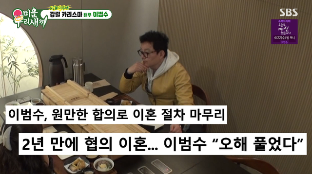 이범수는 방송에서 “한 2~3년 개인사가 있었다”며 이혼을 언급, “개인적으로 슬프고 아픈 기간이었는데, 얼마 전에 잘 해결됐다”고 밝혔다.
