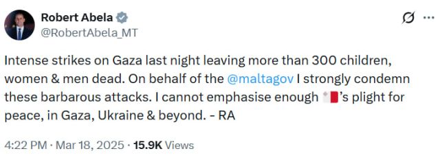 로버트 아벨라 몰타 총리는 지난해 3월 자신의 X에 글을 올려 "몰타 정부를 대표해 (이스라엘의) 야만적인 공격을 강력히 규탄한다"며 "가자지구와 우크라이나, 그리고 그 너머의 평화를 향한 몰타의 간절한 염원을 다시 한번 강력히 강조한다"고 밝혔다.