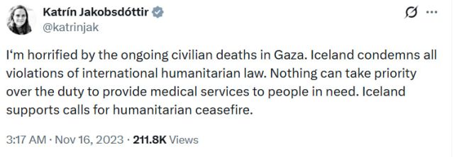 2023년 11월 카트린 야콥스도티르 아이슬란드 당시 총리는 "계속되는 가자지구 민간인 희생에 경악을 금치 못하고 있다"며 "아이슬란드는 국제인도법을 위반하는 모든 행위를 규탄한다"고 자신의 X 계정에 글을 썼다.