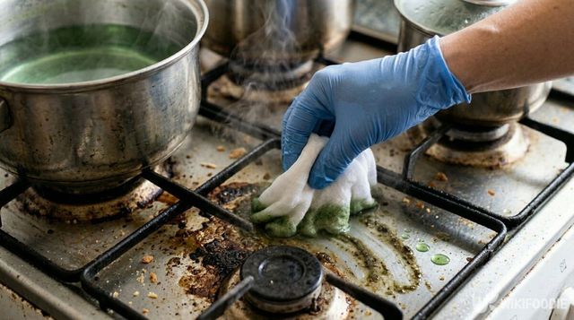 청소는 물이 식기 전에 시작하는 것이 좋다. 고무장갑을 착용한 뒤, 행주를 시금치 물에 충분히 적신다. 그다음 가스레인지 상판과 주변 타일을 골고루 닦아주면 된다.
