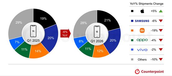 시장조사업체 카운터포인트리서치는 2026년 1분기 글로벌 스마트폰 출하량이 전년 동기 대비 6% 감소했으며, 이는 D램과 낸드 공급 부족, 중동 지역 긴장에 따른 소비 심리 위축 등이 복합적으로 작용한 결과라고 분석했다.ㅇ