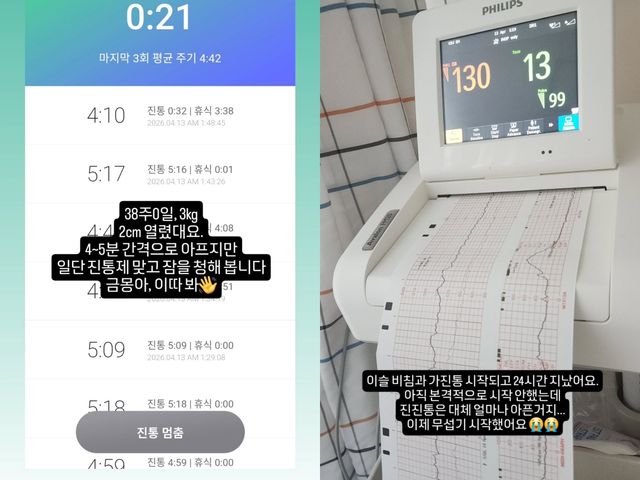 5시간 뒤, 정숙은 "이슬 비침과 가진통 시작되고 24시간 지났어요. 아직 본격적으로 시작 안 했는데 진진통은 대체 얼마나 아픈 거지... 이제 무섭기 시작했어요"라며 출산을 앞두고 두려운 마음을 내비쳤다.