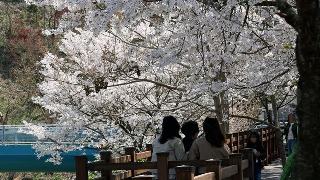 충북 제천시 청풍면에서 상춘객들이 활짝 핀 벚꽃 아래를 걷고 있다. / 연합뉴스