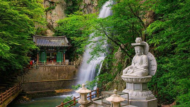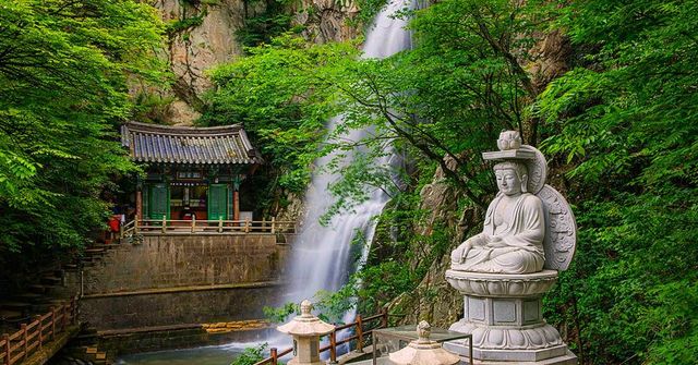 4~5월에는 겨울을 지나 폭포의 수량이 풍부해져 더욱 힘찬 소리를 내고, 주변의 연등과 새잎이 어우러져 화사한 분위기를 자아낸다. 사찰로 들어가는 진입로에는 벚나무와 다양한 봄꽃이 피어 산책하기 적절하다.