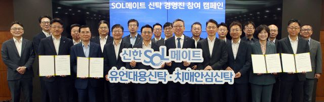 이날 선언식에는 정상혁 신한은행장을 비롯한 21명의 임원진이 참여했다. 신한 SOL메이트 유언대용신탁과 치매안심신탁 가입 서약을 통해 시니어 고객의 자산관리와 자산승계 지원을 강화키로 했다. 또한 ‘신한 SOL메이트 유언대용신탁·치매안심신탁’ 문구가 담긴 홍보물을 활용해 기념 촬영을 진행하고 전 임직원의 관심과 참여를 독려했다.