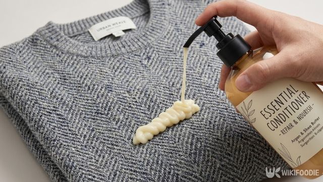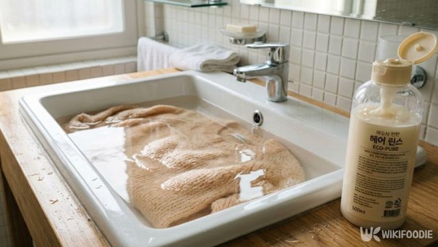 물이 준비되면 헤어 린스를 한 스푼 정도 넣고 완전히 풀어준다. 린스를 너무 많이 사용하면 이후에 냄새가 남거나 섬유 색상이 변할 수 있으므로 소량만 쓰는 것이 좋다.