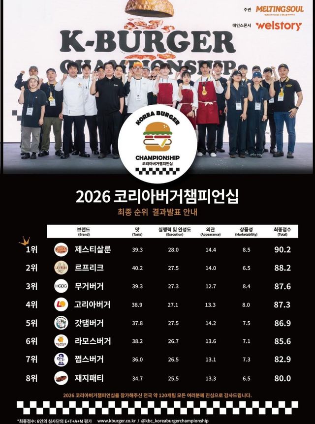 대한민국 최고의 수제버거를 가리는 ‘2026 코리아 버거 챔피언십(KBC)’이 긴 여정을 마치고 최종 순위를 발표했다. 이번 대회는 단순히 맛의 대결을 넘어 한국을 대표하는 버거 브랜드로서의 성장 가능성과 독창성을 평가하는 자리였다. 총 118개 팀이 참가한 가운데 치열한 블라인드 테스트와 본선을 거쳐 최종 승자가 가려졌다.