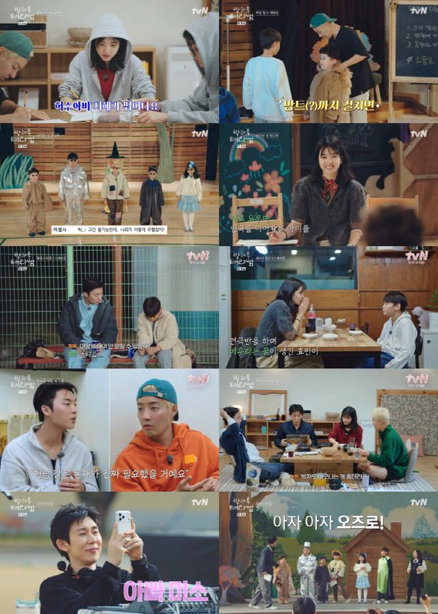 아홉 번째 수업에서는 연극 ‘오즈의 마법사’ 의상, 음악 감독 코드 쿤스트가 만든 음악과 함께하는 런스루가 펼쳐졌다. 본격적인 시작 전, 김태리와 최현욱, 강남은 아이들과 연습하며 맞춤형 조언을 건넸고 그중에서도 강남은 허수아비 역 효민이의 불편한 기색을 눈치채고 마음을 풀어주는 섬세한 면모로 눈길을 끌었다.