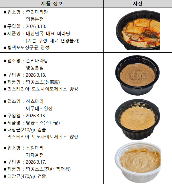 업체별로는 춘리마라탕의 마라탕과 땅콩소스에서 각각 황색포도상구균과 리스테리아균이 검출됐으며, 샹츠마라와 소림마라의 땅콩소스에서도 대장균 및 리스테리아균이 확인됐다.