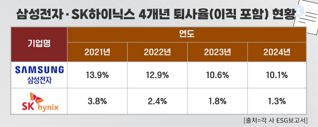 삼성전자 역시 상황은 충분히 파악하고 있는 모습이다. 삼성전자가 발표한 지속가능경영보고서에 따르면 2024년 연간 퇴직률(이직률 포함)은 10.1%를 기록하며 4년 연속 10%대를 벗어나지 못하고 있다. 경쟁사인 SK하이닉스의 행보와 극명하게 대조되는 모습이다 .SK하이닉스의 퇴직률은 2021년 3.8%에서 2024년 1.3%로 대폭 하락하며 10년 사이 최저치를 기록했다.
