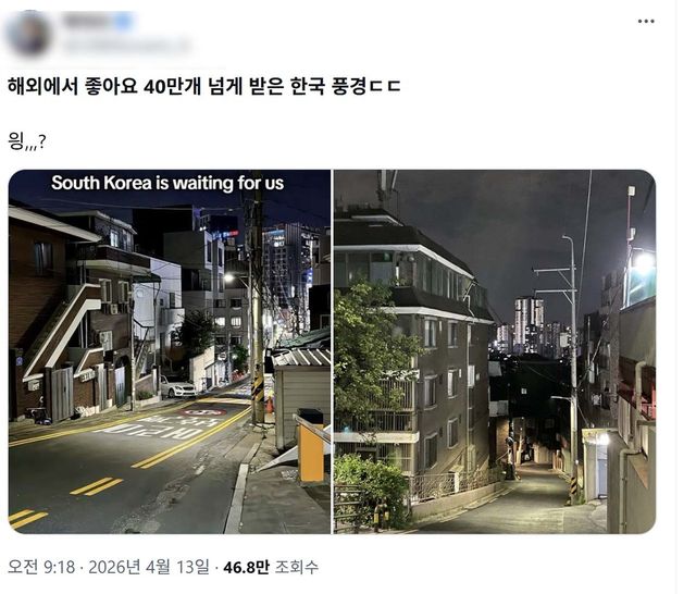 "South Korea is waiting for us(한국이 우리를 기다린다)." 사진에 적힌 문구다. 경기 지역 한 도시의 골목길을 담은 것으로 보이는 야경 사진이 X에 올라와 국내 온라인 커뮤니티에도 빠르게 퍼졌다. 반응은 한결같았다. "이게 왜?" "진짜 저게 왜?" "어느 요소를 봐야 하는지 아직도 모르겠음.“