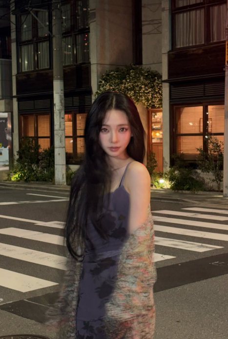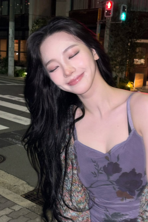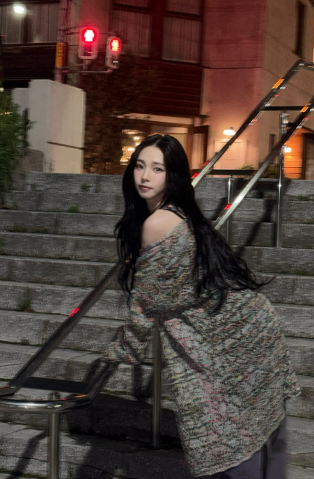 사진 속 카리나는 한적한 밤거리 계단에서 보랏빛 플로럴 원피스와 가디건을 매치해 몽환적인 스타일을 선보였다. 난간에 기대거나 계단에 앉아 카메라를 응시하는 등 다양한 포즈로 시선을 모았다.