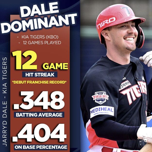 데일은 앞서 KBO리그 첫 출전을 이룬 3월29일 인천 SSG 랜더스전부터 안타를 뽑아냈으며 12일 한화전까지 12경기 연속 안타 작성에 성공, 외인 타자 이 부문 최장 타이기록을 세웠다.