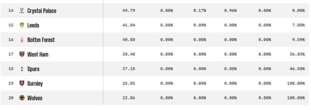 강등 확률에서 토트넘은 46.50%, 웨스트햄은 36.03%로 토트넘이 더 강등 확률이 높아졌다.