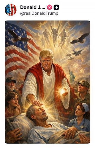 트럼프 대통령은 이러한 메시지를 게재한 이후 예수 그리스도와 유사한 모습을 하고 있는 본인이 그려져 있는 그림을 게재했다. 이 그림 안에는 트럼프 대통령이 누워있는 남성에게 안수 기도를 하는 듯한 모습이 담겼다.