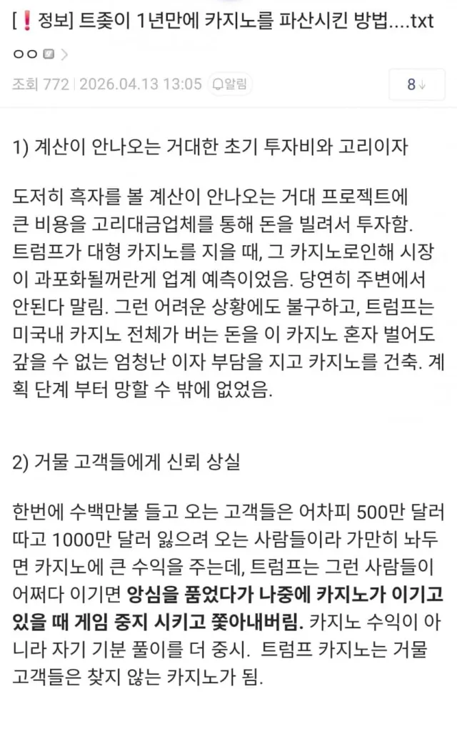 이렇게 카지노 3곳을 파산 시켰다고함.....