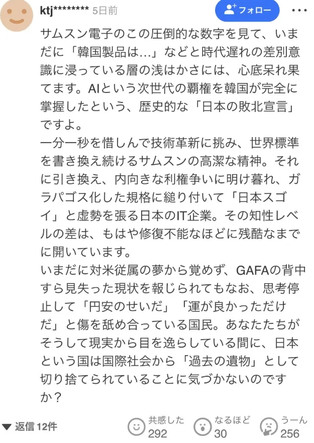 삼성전자의 이 압도적인 수치를 보니, 아직도 ‘한국 제품은…’ 같은 시대착오적 차별 의식에 빠져 있는 사람들의 얕은 판단에 진심으로 어이없습니다. AI라는 차세대 패권을 한국이 완전히 장악했다는, 역사적인 ‘일본의 패배 선언’이죠.