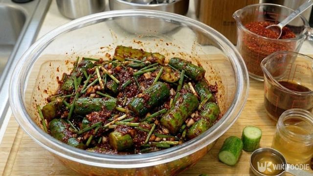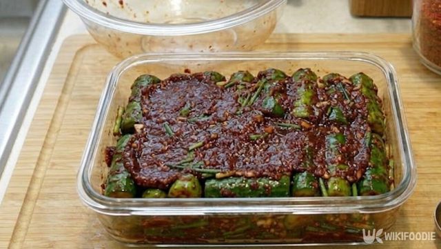 끓는 소금물에 담갔던 오이는 건져 충분히 식힌 뒤 사용한다. 겉에 남은 열기가 빠진 상태에서 양념을 넣어야 식감이 유지된다. 식힌 오이는 칼집 사이에 양념을 적당량씩 나눠 넣는다.