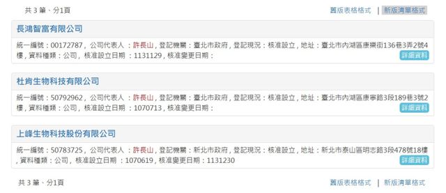 이외에도 허 대표가 대만에서 총 3개 법인을 갖고 있는 것으로 나타났다. 허 대표는 서밋바이오텍 외에 장홍지부유한회사(長鴻智富有限公司), 두컨생물과기유한회사(杜肯生物科技有限公司)의 대표인 것으로 드러났다. 두 회사 모두 이사로 허 대표만 등재된 단일 인물 구조로 파악된다.
