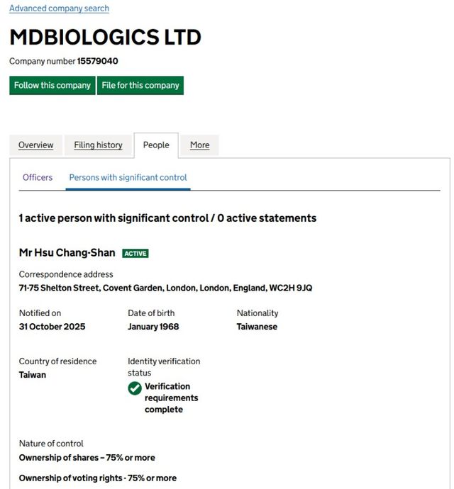허 대표가 지배하고 있는 영국 법인 MD바이오로직스는 2024년 3월 20일 설립된 비상장 유한회사로 파악된다. 등기상 허 대표가 지난해 10월 31일 기준 지분 75% 이상과 의결권을 보유한 실질적 지배자(PSC)로 등록돼 있다. 이 회사의 자본금은 100파운드(약 20만원)에 불과하다. 이 회사의 주소지(71–75 Shelton Street)는 수천 개의 법인이 공유하는 가상 오피스 주소로 알려져 있다.