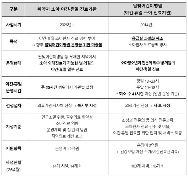 이번 사업은 달빛어린이병원이 운영되고 있지 않은 소아의료 취약지역을 대상으로 새롭게 추진된다. 경증 환자로 인한 응급실 과밀화 해소를 위해 주 7일, 평일 야간(18~23시)과 휴일(10~18시)의 정해진 시간 동안 소아 환자 진료를 목표로 하는 기존의 달빛어린이병원 제도와 달리 이번 사업에 참여하는 의료기관은 지방자치단체와 협의해 주 20시간의 범위에서 야간·휴일 진료 시간을 탄력적으로 설정할 수 있다.