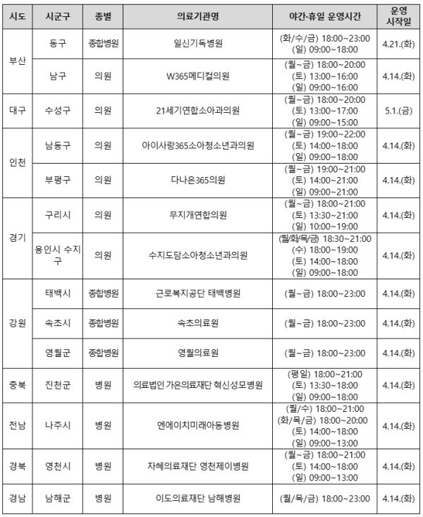 정부는 취약지 소아 야간·휴일 진료기관에 연간 1억2000만 원(국비 50%, 지방비 50%)의 운영비를 지원한다. 선정된 지역의 의료기관들은 준비가 완료된 곳부터 4월 중 순차적으로 야간·휴일 진료를 시작해 5월까지 14개소가 모두 운영을 개시할 예정이다.