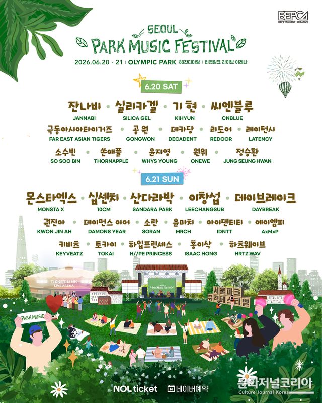 한편 ‘2026 서울 파크 뮤직 페스티벌’ 티켓은 NOL티켓과 네이버예약을 통해 예매할 수 있으며, 타임테이블 및 현장 운영 관련 세부 정보는 공식 홈페이지와 SNS 채널을 통해 순차적으로 공개될 예정이다.
