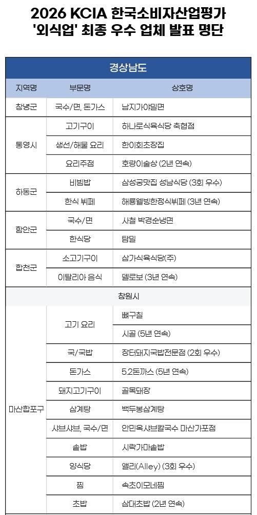 한국소비자평가가 대한소비자협의회와 함께 진행한 ‘2026 KCIA 한국소비자산업평가(외식업)’의 경남 일부 지역(창녕군, 창원시, 통영시, 하동군, 함안군, 합천군) 평가 결과를 발표했다. 이번 평가는 실제 소비자 경험을 기반으로 외식업체의 서비스 수준을 종합적으로 분석·선정했다는 점에서 객관성과 실효성을 강조한 것이 특징이다.
