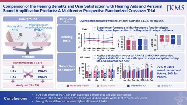 연구진은 “보청기는 PSAP보다 청력 성능과 사용자 만족도 모두에서 우수한 결과를 보였다”며 “난청 환자의 적절한 청각 재활을 위해서는 PSAP보다 보청기 사용을 우선적으로 고려해야 한다”고 전했다.