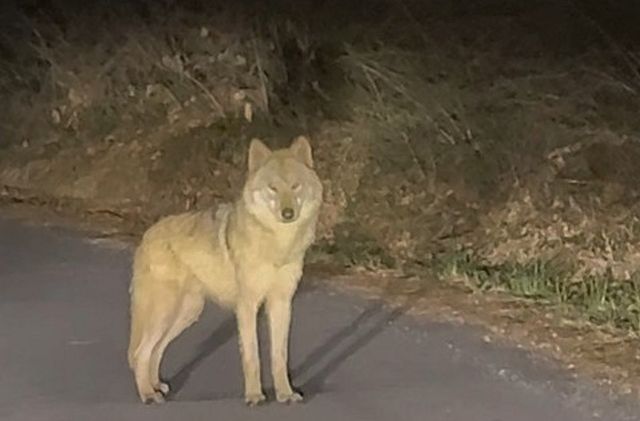 대전 오월드 탈출 이후 한동안 행방이 묘연했던 늑대 '늑구'가 지난 13일 오후 10시 43분쯤 오월드 인근 야산에서 목격됐다. 사진은 목격한 시민이 찍은 '늑구' 모습. 수색 당국이 늑대 '늑구'에게 생포를 위해 마취총을 발사했지만 빗나간 것으로 전해졌다. / 연합뉴스