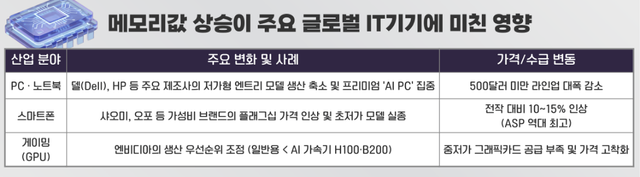 일반 게이머용 보급형PC 부품도 직격탄을 맞았다. 엔비디아(NVIDIA)가 일반 소비자용 기기보다 수배 이상 수익을 올리는 AI 가속기(H100, B200 등) 생산에 파운드리 용량을 우선 배정하면서 중·저가형 그래픽카드 공급 부족과 가격 상승이 고착화됐기 때문이다. '가성비 PC 구매'가 사실상 불가능해지면서 저렴한 가격에 고성능을 즐기려던 소비자들이 구매를 포기하는 '테크 양극화' 또한 심화되고 있다. 카운터포인트 리서치는 "스마트폰 제조사들이 부품 수급 우선순위에서 밀린 저가형 모델 대신 고단가 제품 판매에 집중하면서 글로벌 스마트폰 평균 판매 가격(ASP)이 역대 최고치를 경신하고 있다"고 분석했다.