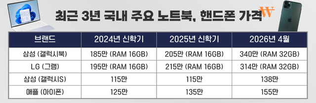 스마트폰 역시 상황은 크게 다르지 않다. 메모리 용량 차이뿐 아니라 신제품의 핵심 경쟁력 중 하나인 AI 기술 발전이 가격 상승을 견인하고 있다. 실제로 삼성 갤럭시S 스마트폰 출고가는 지난해 115만원에서 올해 134만원으로 상승했다. 애플 또한 AI 기능 확대에 따라 지난해보다 20만원 높은 가격에 아이폰을 출고하고 있다.