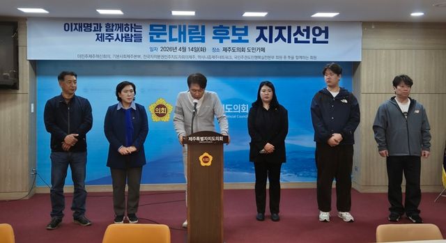 더민주혁신회의, 기본사회제주본부, 전국자치분권민주지도자회의 제주지역, 먹사니즘제주네트워크, 국민주권도민행복실천본부 소속 회원들 중 문대림 후보 지지에 동참한 회원 일동은 14일 오후 제주도의회 도민카페에서 기자회견을 열고 "이재명 정부와 가장 강한 신뢰·실행력으로 연결된 후보는 바로 문대림 후보"라고 밝혔다.