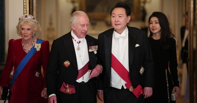 영국을 국빈 방문 중인 윤석열 대통령이 2023년 11월 21일(현지 시각) 런던 버킹엄궁에서 열린 국빈 만찬에 입장하며 찰스 3세 영국 국왕과 대화하고 있다. 오른쪽은 김건희 여사, 왼쪽은 커밀라 왕비. / 연합뉴스
