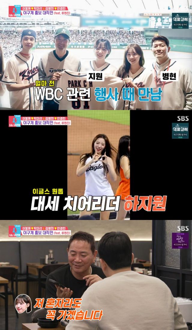 이에 김병현은 "시즌 중이라 선수들은 힘들고, 가장 유명한 치어리더가 있다"면서 하지원과 전화 연결을 했다.