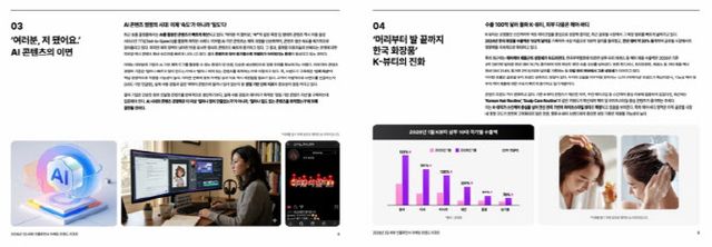 K-뷰티 분야에서는 국내 화장품이 헤어케어, 바디케어 등 전 카테고리로 영향력을 확장하는 ‘머리부터 발끝까지 한국 화장품’ 현상이 관찰됐다. 단순 스킨케어를 넘어 라이프스타일 전반으로 K-뷰티 개념이 진화하고 있음을 보여준다.