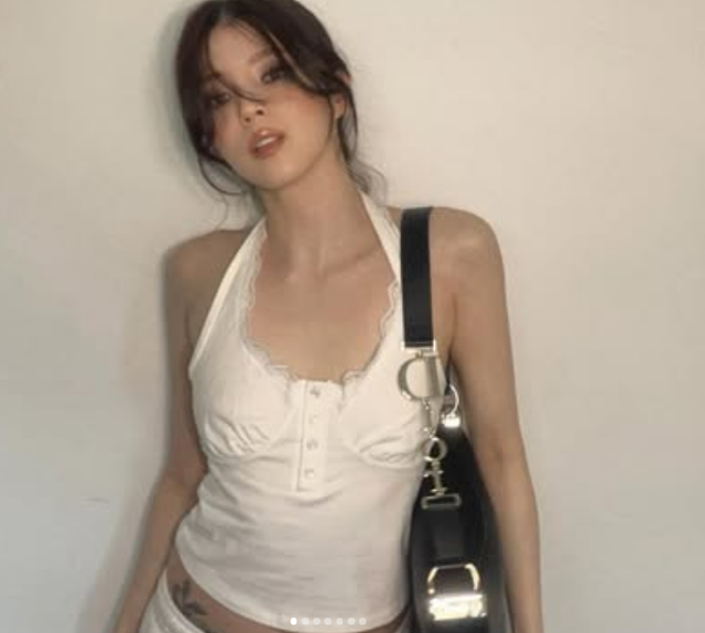 사진 속 한소희는 흰색 홀터넥 슬리브리스 톱을 입고 포즈를 취하고 있다. 시원하게 드러낸 직각어깨 라인과 더불어 크롭 기장 상의 아래 살짝 드러난 골반 부근 타투에 시선이 집중된다.