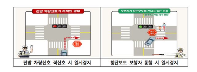 현행 도로교통법에 따르면 운전자는 우회전하려는 경우 전방 차량 신호가 적색이면 차량 진행방향의 정지선·횡단보도·교차로 앞에서 일시정해야 하고, 우회전 후 만나는 횡단보도에서 보행자가 건너고 있거나 건너려고 하는 경우에도 일시정지해야 한다.