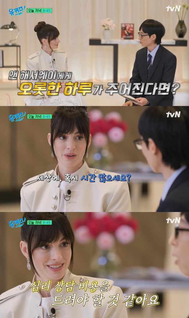이에 앤 해서웨이는 유재석을 바라보며 "세상에, 혹시 시간이 많으시냐. 심리 상담 비용을 드려야 할 거같다"며 상담을 요청해 눈길을 끈다.