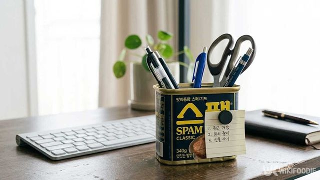 스팸 캔이 강철 소재라는 사실을 활용하면 책상 위 정리 도구로도 쓸 수 있다. 자석이 붙는 재질이기 때문에 캔 겉면에 자석을 이용해 메모지, 영수증, 작은 메모 쪽지를 고정해둘 수 있다. 캔을 세로로 세워두면 겉면은 메모판이 되고, 캔 안쪽에는 볼펜이나 가위, 칼 같은 자주 쓰는 소도구를 꽂아 보관할 수 있다. 메모를 붙여두는 자석은 작은 판형 자석이나 버튼 자석이면 충분하다.